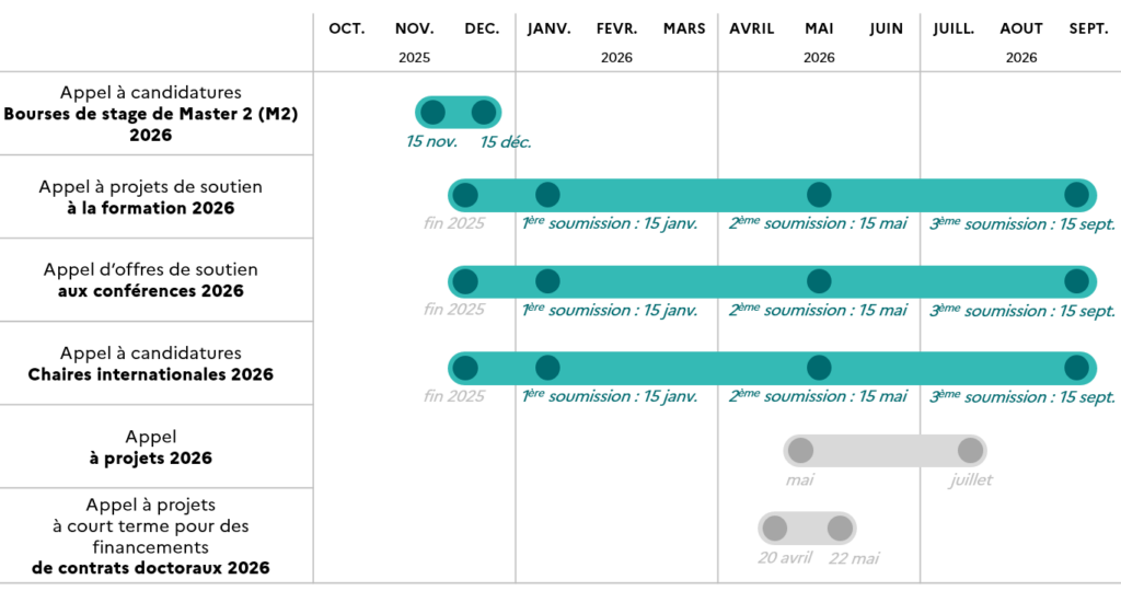 Voici un calendrier prévisionnel, sous réserve de modifications, des appels du Programme de recherche Mathématiques en interaction sur les trimestres à venir :