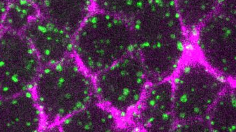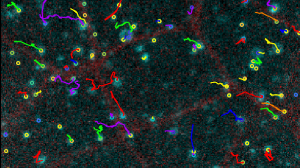 Molécules de type Rab5 (en vert) et Dextran (en mauve) imagées par spinning-disk confocal © Claudio Collinet (IBDM)